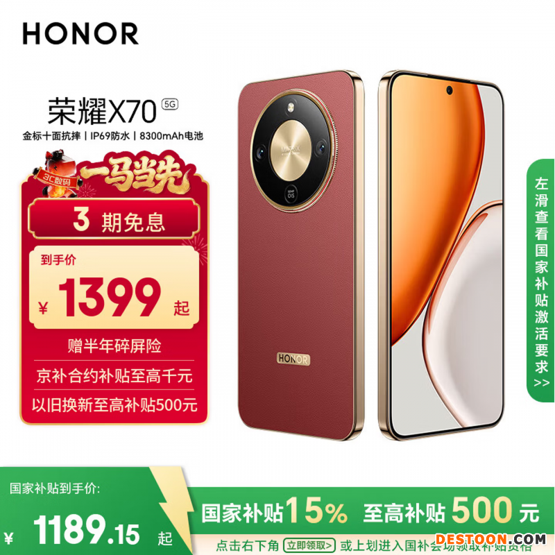 荣耀X70 8+128 朱砂红 金标十面抗摔 8300mAh青海湖电池 IP69防水 荣耀绿洲护眼屏 AI手机