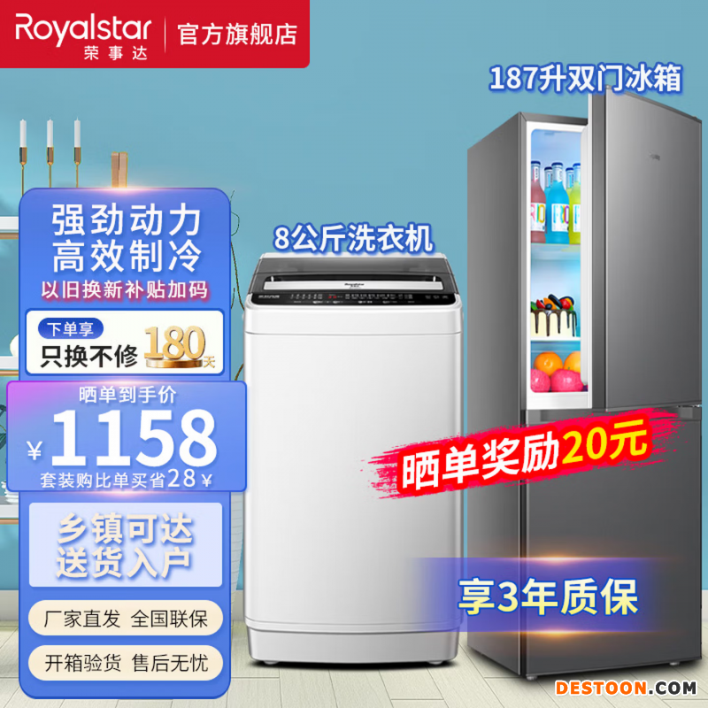 荣事达冰洗套装二门冰箱双开门+全自动洗衣机 冰箱洗衣机组合套装 冰箱187L银+全自动洗衣机8公斤