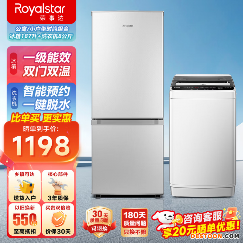 荣事达(Royalstar)冰洗套装 8公斤全自动洗衣机+187升双门冰箱 家用出租房节能轻音 8KG洗衣机+187升冰箱灰色