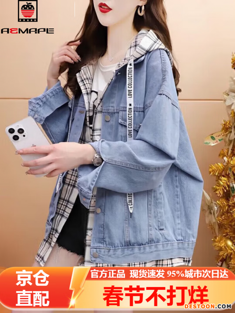 AEMAPE 宽松假两件连帽牛仔外套女2026新款春秋冬季短外套女慵懒风上衣 MX-10-8111_蓝色 S (建议115斤以内)