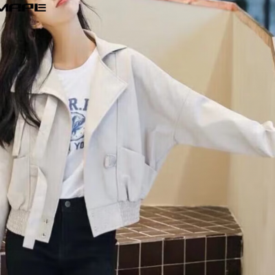 AEMAPE外套女2026春秋冬季新款时尚减龄皮衣短外套女韩版宽松显瘦上衣 米白色 S _85-100斤可穿